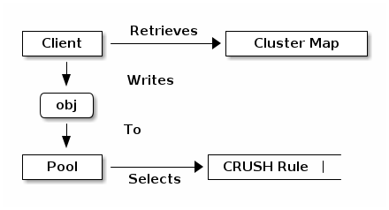 A Ceph Client, via librados, interacts directly with OSDs to store and retrieve data. To interact with OSDs, the client app must invoke librados and connect to a Ceph Monitor. Once connected, librados retrieves the Cluster Map from the Ceph Monitor. When the client app wants to read or write data, it creates an I/O context and binds to a Pool. The pool has an associated CRUSH rule that defines how it will place data in the storage cluster. Via the I/O context, the client provides the object name to librados, which takes the object name and the cluster map (i.e., the topology of the cluster) and computes the placement group and OSD for locating the data. Then the client application can read or write data. The client app doesn’t need to learn about the topology of the cluster directly.