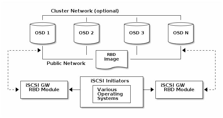 The iSCSI Gateway presents a Highly Available (HA) iSCSI target that exports RADOS Block Device (RBD) images as SCSI disks. The iSCSI protocol allows clients (initiators) to send SCSI commands to storage devices (targets) over a TCP/IP network, enabling clients without native Ceph client support to access Ceph block storage.